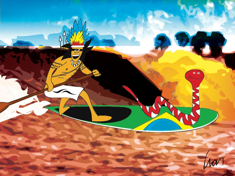 Pira e Joca, sua sucuri de estimação, cavando com estilo na Pororoca. Arte: Ivan Nóbrega |